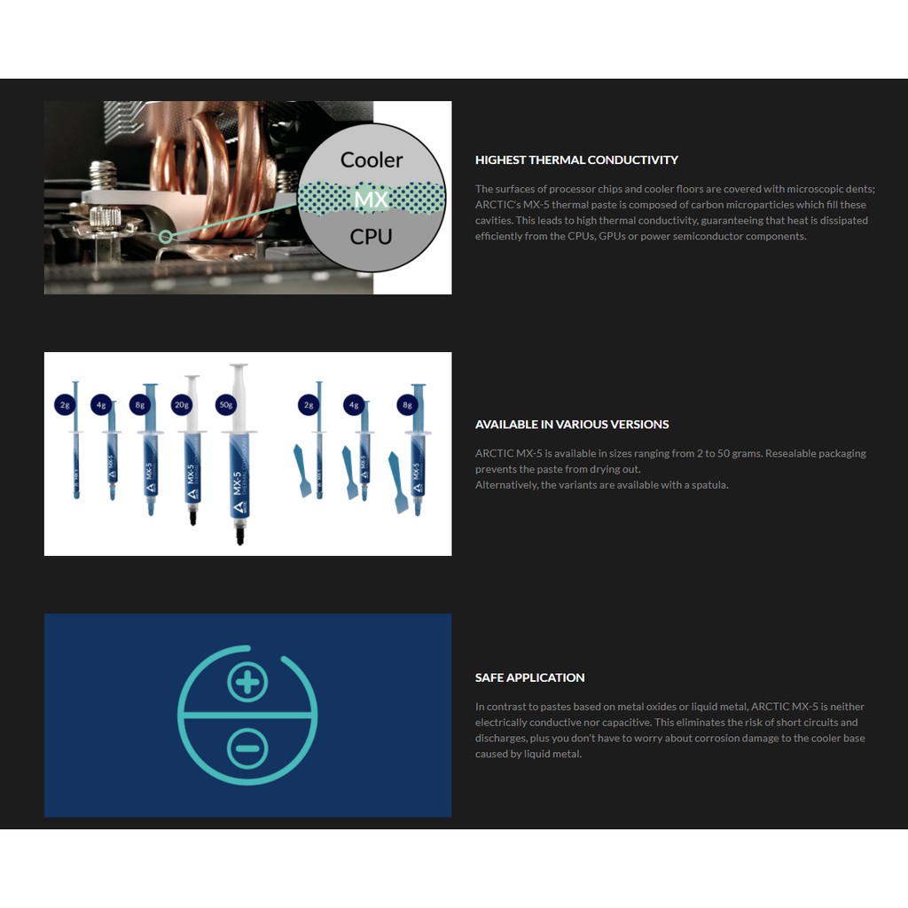 - Trái ngược với bột nhão dựa trên oxit kim loại hoặc kim loại lỏng, ARCTIC MX-5 không dẫn điện cũng không điện dung. Điều này giúp loại bỏ nguy cơ đoản mạch và phóng điện, ngoài ra bạn không phải lo lắng về sự ăn mòn làm hỏng đế làm mát do kim loại lỏng gây ra.