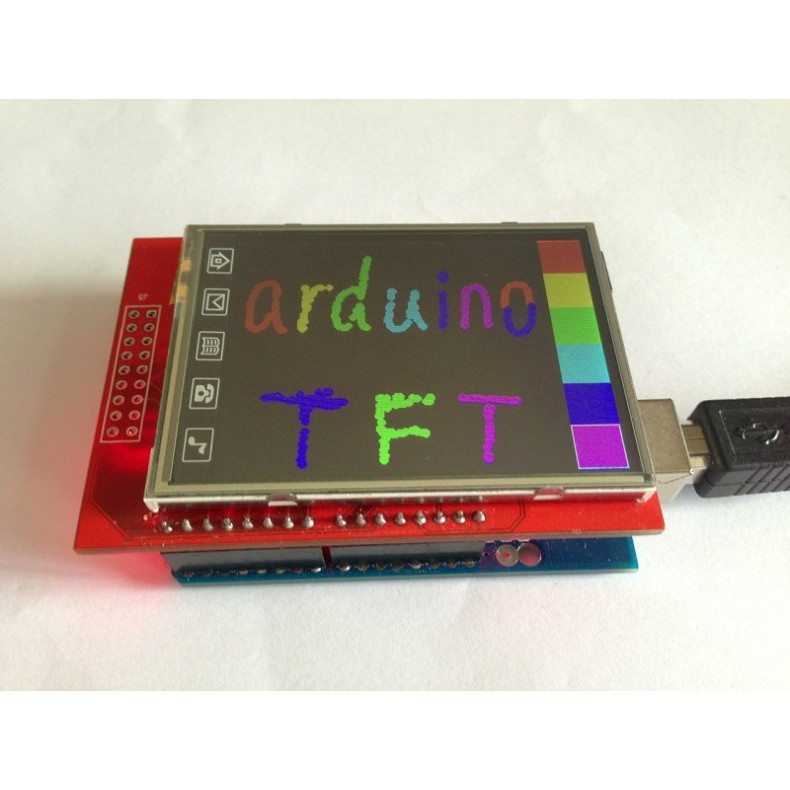 Arduino LCD TFT cảm ứng 2.4 inch Shield (Arduino UNO). Được thiết kế dạng shield cắm trực tiếp trên Arduino UNO hoặc MEGA2560. Hỗ trợ khe cắm thẻ nhớ microSD.1. Thông số kĩ thuật