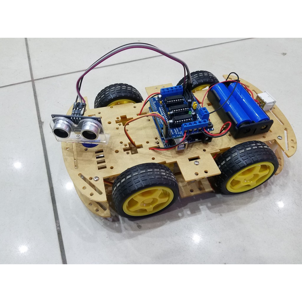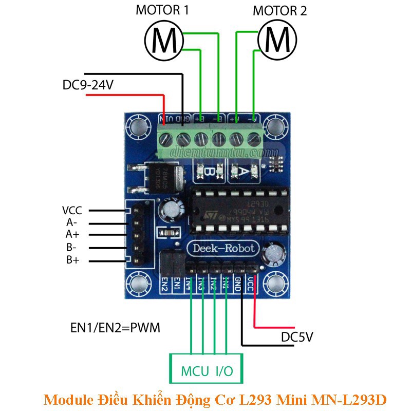 + 4 động cơ một chiều (M1, M2, M3, M4) độc lập thông qua 4 cầu H của L293D dòng 600mA (cực đại 1.2A). Hoặc 2 động cơ bước loại đơn cực (unipolar) hoặc lưỡng cực (bipolar).