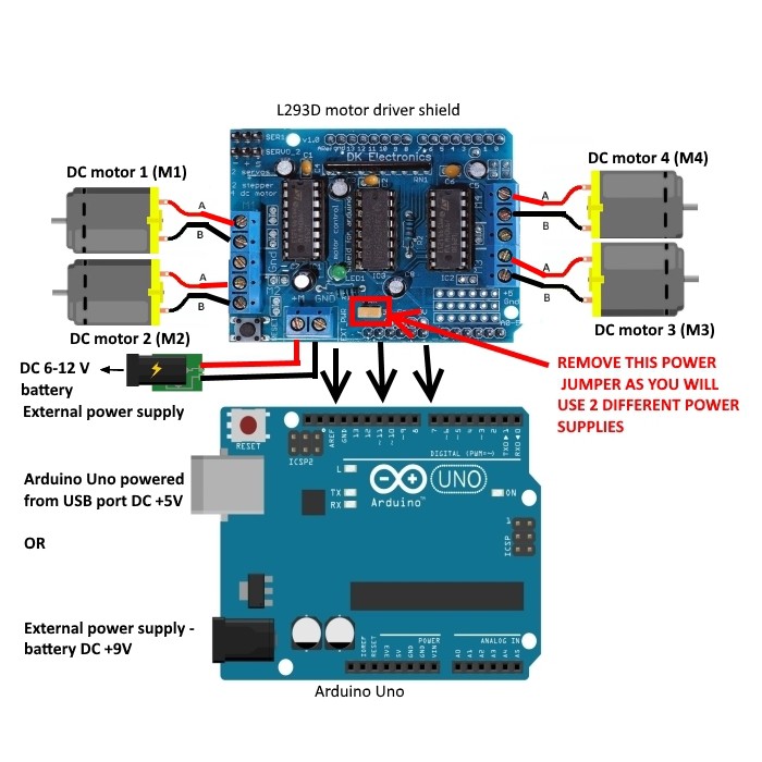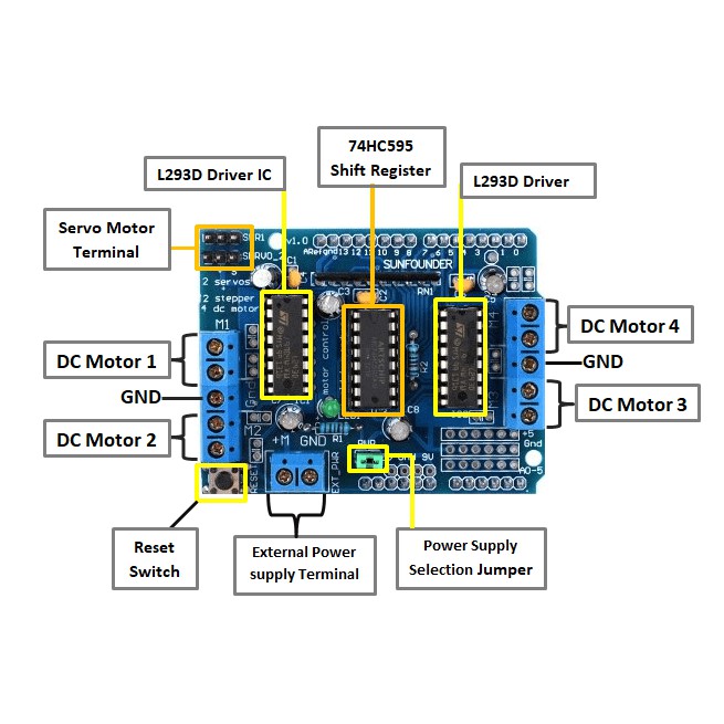 Trên shield có 1 jumper màu vàng PWR được sử dụng nếu kết nối nguồn ngoài cho board Arduino thông qua jack DC (dùng pin 9V chẳng hạn) thì nguồn nuôi motor được lấy luôn từ jack này, không cần nối nguồn với EXT_PWR. Nếu ngắt jumper, bạn cần nối 1 nguồn riêng vào terminal EXT_PWR để nuôi motor.