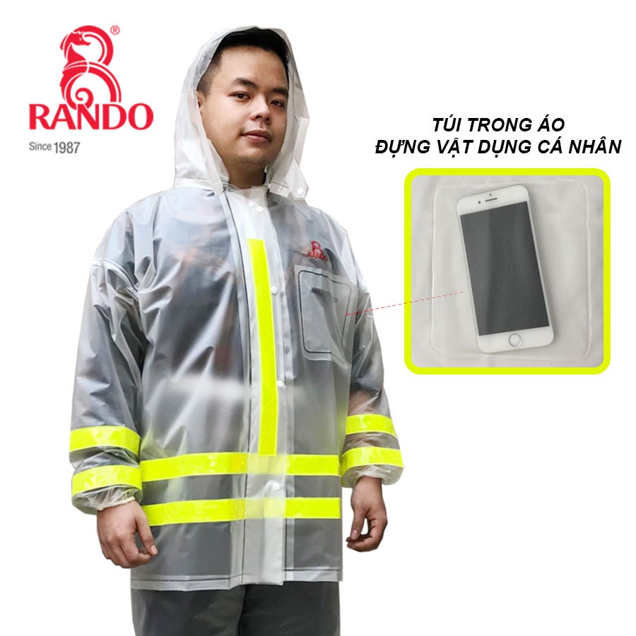 Thời Trang Cá Tính Cho Nam/Nữ, Bộ áo đi mưa Trong Màu Phản Quang không chỉ giúp che mưa toàn thân mà còn là dòng sản phẩm thời trang và cá tính cho các khách hàng yêu thích sự nhẹ nhàng, mang nét thẩm mỹ khi đi trong mưa, là - Áo Mưa Rando Chính Hãng, Bộ Quần Áo Đi Mưa Nhựa PVC Trong Màu Phản Quang Chống Thấm nước, An Toàn, sản phẩm tiện ích giúp người mặc thuận tiện hơn trong những ngày mưa bão. Bộ áo mưa được thiết kế với chất liệu PVC trong mờ, nhẹ nhàng , thao tác mặc rất nhanh gọn giúp che phủ toàn bộ lớp quần áo chính của mình, người mặc sẽ được bảo vệ toàn thân, tránh được nước mưa từ mọi phía (trước, sau, trái phải)- Thiết kế Nón trùm đầu rời và Phản quang an toàn