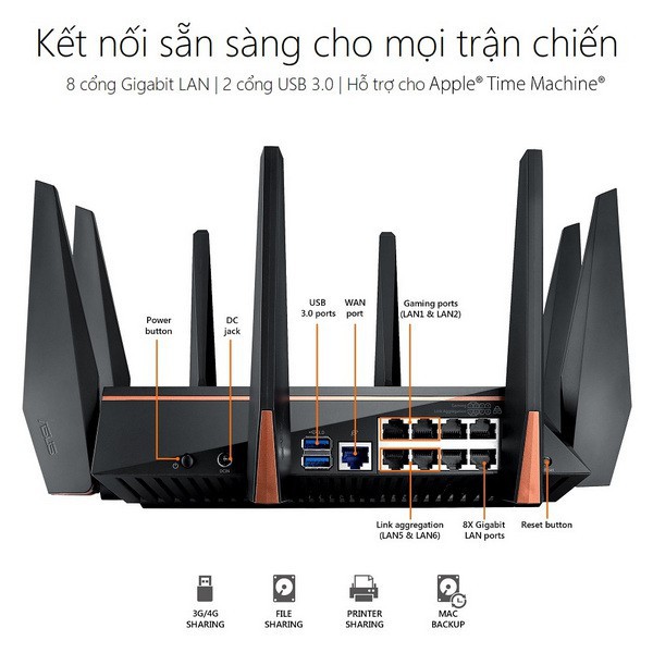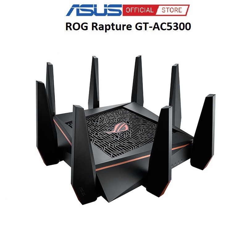 ASUS ROG Rapture GT-AC5300 (Gaming Router) AC5300 WTFast, AiMesh 360 WIFI Mesh, 3 băng tần, chipset Broadcom, AiProtecti- 3 băng tần chuẩn AC5300 (2.4Ghz:1000Mbps+ 5GHz: 2167Mbps + 5GHz: 2167Mbps), 8 ăng-ten rời 5dBi. Cổng: 8 port x 10/100/1000 Lan, 1x 10/100/1000 Wan, 2 x USb 3.0