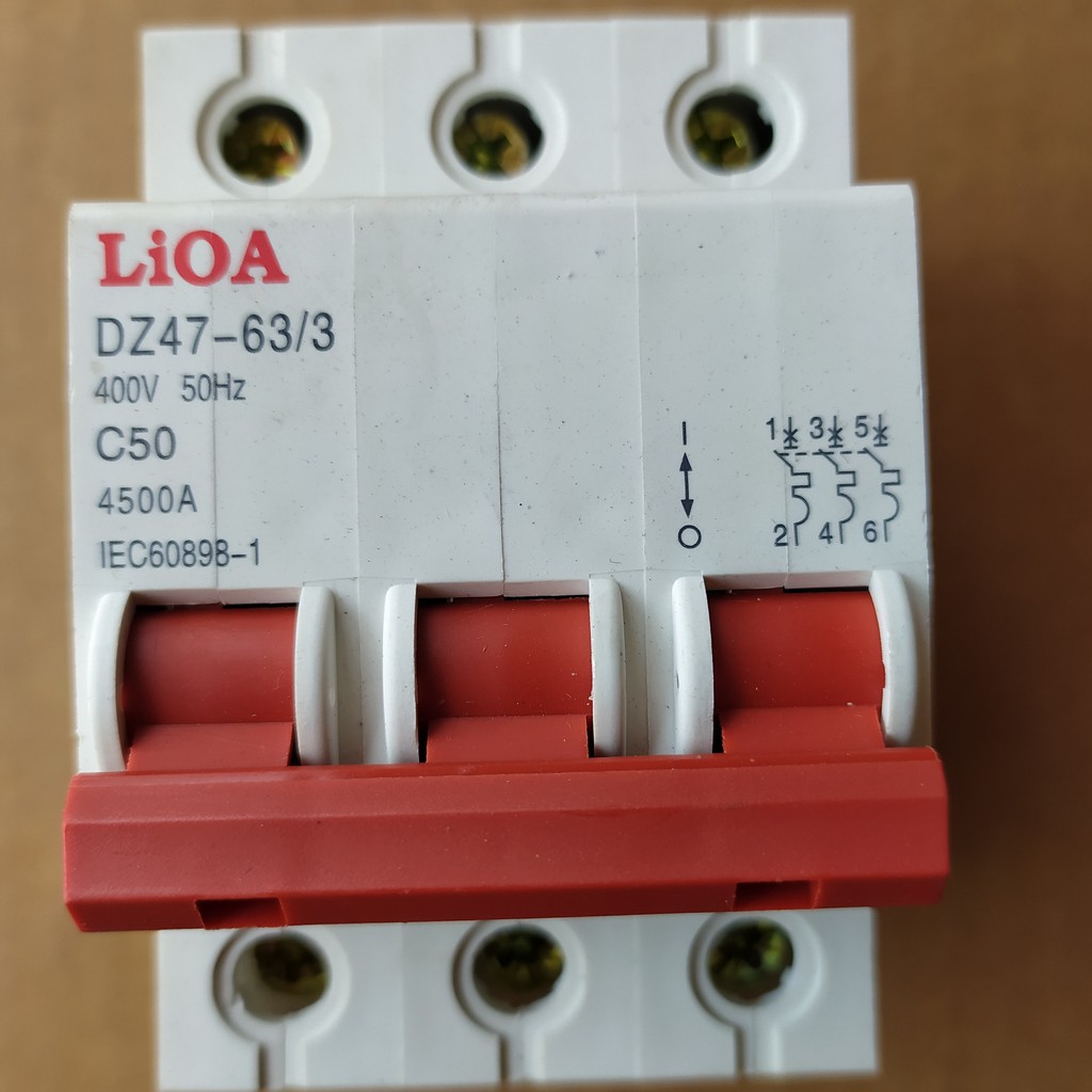 - Điểm tiếp xúc với dây nguồn được sử dụng bằng 6 vít kẹp trên và dưới rất chắc chán và an toàn.trên mỗi ATTOMAT có ghi ký hiệu dấu ( I và O). I là ở trên và O là ở dưới. theo chiều thuận của AT, đây là quy tắc lắp dây ( VÀO TRÊN RA DƯỚI,).Tức là dây nguồn vào lắp ở cực trên ký hiệu ( I) và dây nguồn ra thiết bị sử dụng thì lắp ở cưc dưới ký hiệu ( O) . Và với AT 3 cực này thì sẽ tương đương với 3 dây LỬA ( dây dương) nằm ở 3 cực trên được đánh số ( 1,3,5.) còn 3 cực dưới là ra phụ tải được đánh số ( 2,4,6).