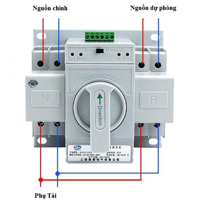 nút điền khiển trên đầu thiết bị về Automatic (tự động), công tắc sẽ chuyển về Normal power (điện lưới) hoặc Reverse power (điện dự phòng) một cách tự động + Nhấn nút về Manual (thông thường), người sử dụng sẽ phải tự chuyển Direction(nguồn điện) bằng tay. - Khi cả hai bên nguồn điện ưu tiên và nguồn điện dự phòng đều có điện thiết bị sẽ chuyển chuyển mạch về phía nguồn ưu tiên cấp điện cho phụ tải bằng nguồn ưu tiên. - Chú ý: Nguồn sẽ bị gián đoạn khi chuyển mạch - Thiết bị này không đề được máy phát