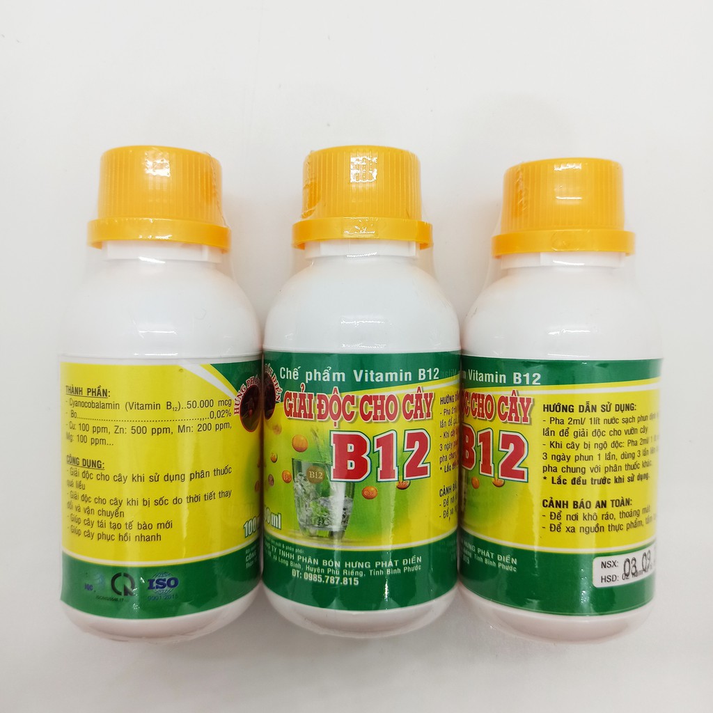 THÀNH PHẦN: Cyanocobalamin(vitamin b12)..50.000..mc.Bo .............................................. 0,02%.Cu: 100 ppm, An 500 ppm, Mn:200 ppm, Mg: 100 ppm.TÁC DỤNG B12 ĐỐI VỚI PHONG LAN:- Phân giúp chống sốc cho phong lan và cây cảnh khi gặp các điều kiện thời tiết bất lợi từ môi trường.- Chống sốc cho lan trong quá trình vận chuyển cây đi xa hoặc thay chuyển chậu mới.- Giúp cây tái tạo tế bào mới, làm tế bào hoạt động và giúp trao đổi chất tốt hơn, phục hồi sức sống cây trồng.