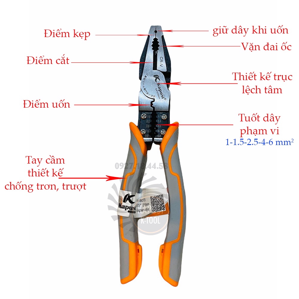-Kìm Điện: Công dụng: Kẹp, Cắt, Uốn, Cuộn và Tuốt dây Tuốt dây điện: đường kính 1.0-6.0 mm2 (8-18 AWG)