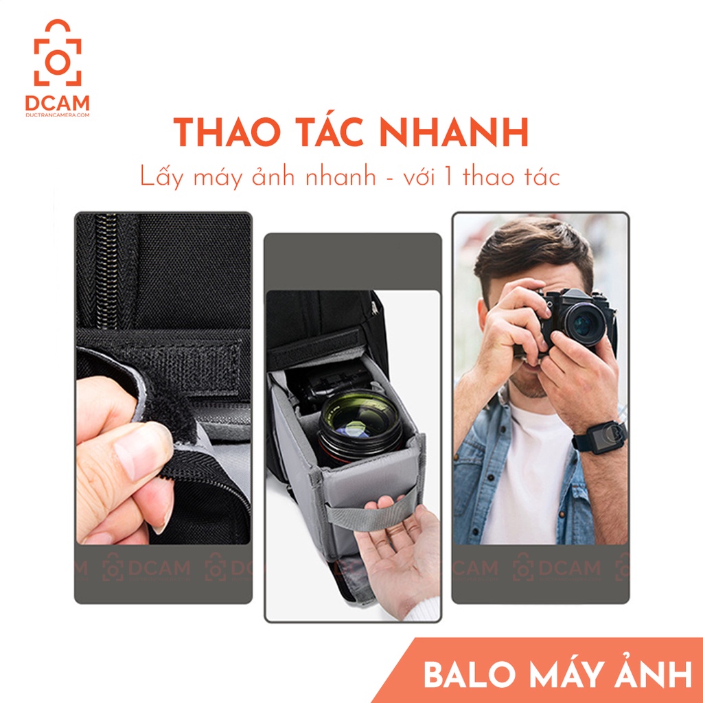 Balo máy ảnh Caden Half Photo - CHỐNG NƯỚC 100% - Thao tác nhanh - Có ngăn đựng lapop