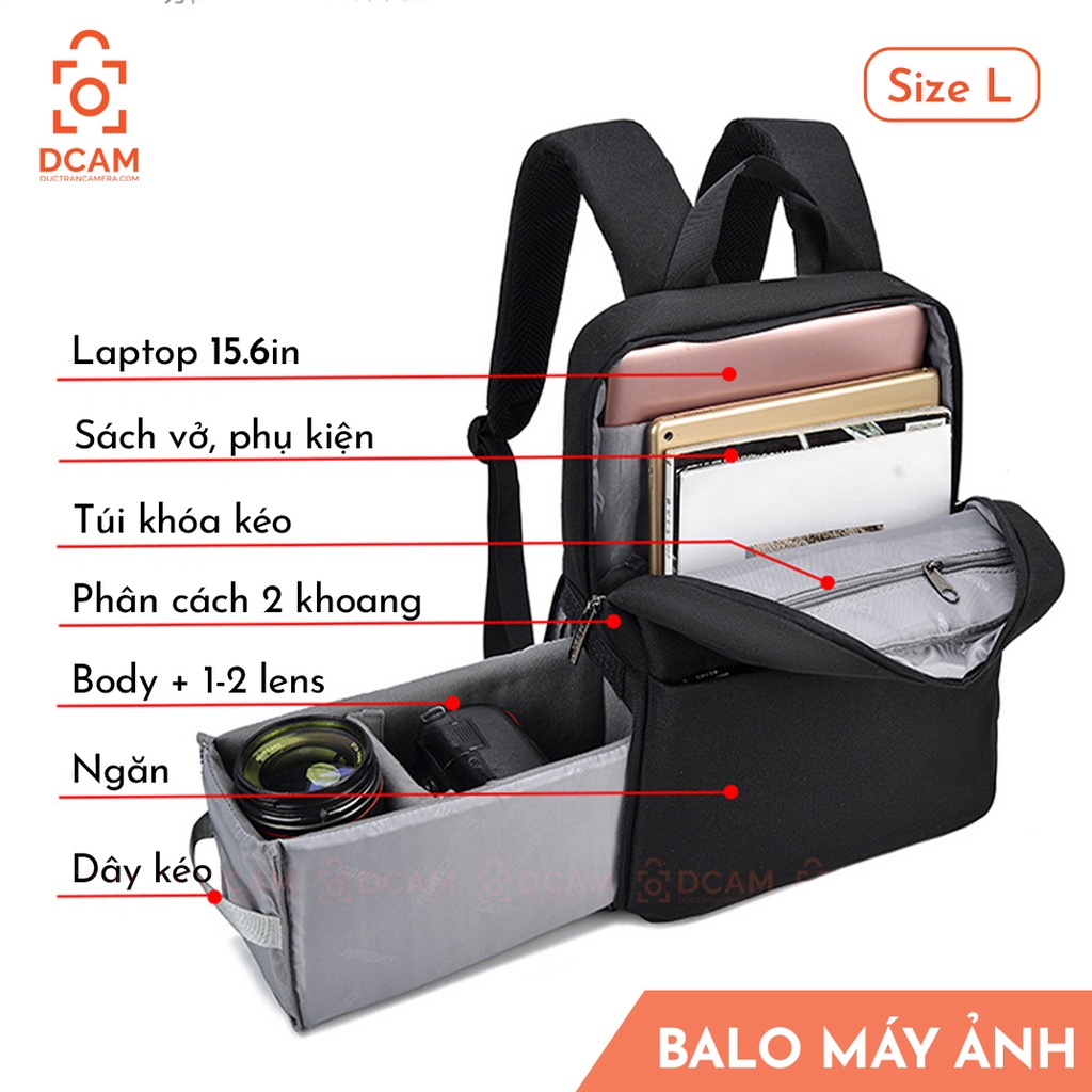👉 Lớp phân cách giữa khoang máy ảnh và khoang phụ kiện có thể tháo rời => biến chiếc balo này trờ thành balo thường đựng sách vở, quần áo thông thường (2 khoang khi nối liền đựng được cả laptop 15,6in to dày)