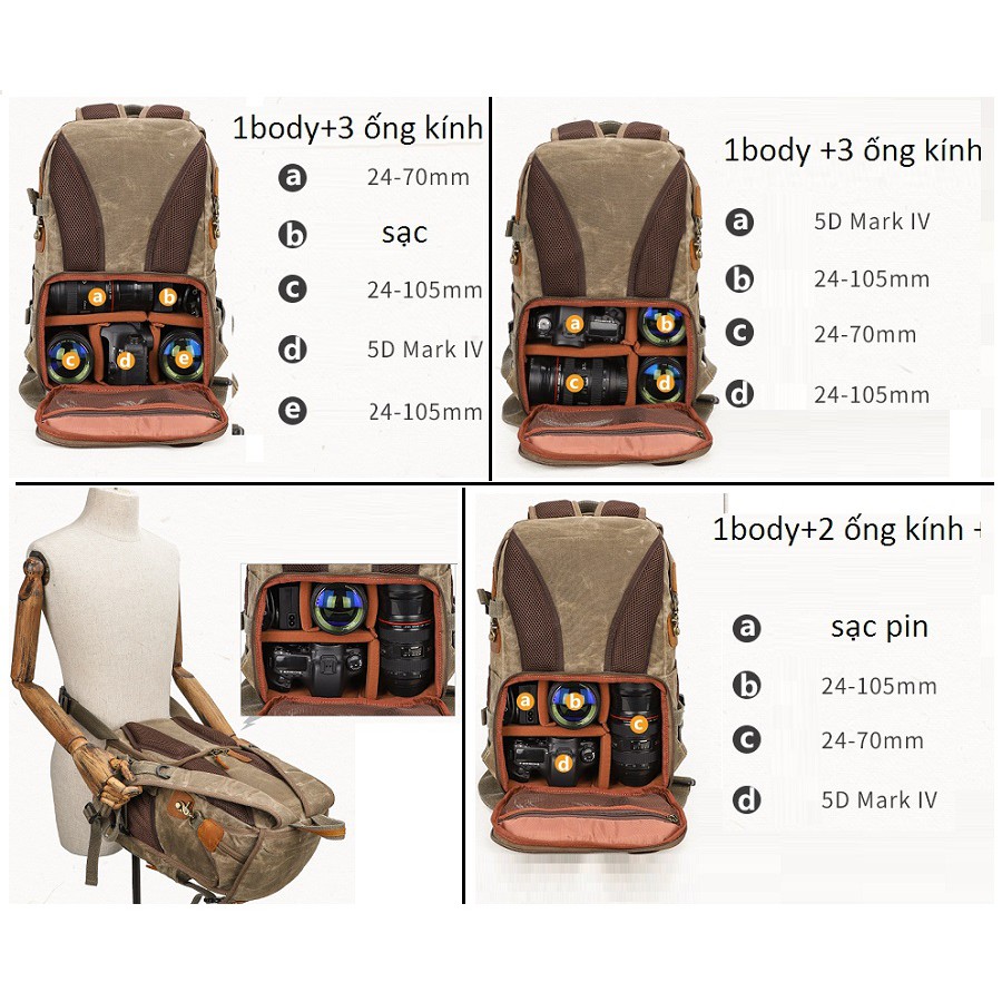 _Balo có sức chứa : 1body + 3 ống kính +phụ kiện đi kèm. hoăc 2 body + 2 ống kính và phụ kiện đi kèm.
