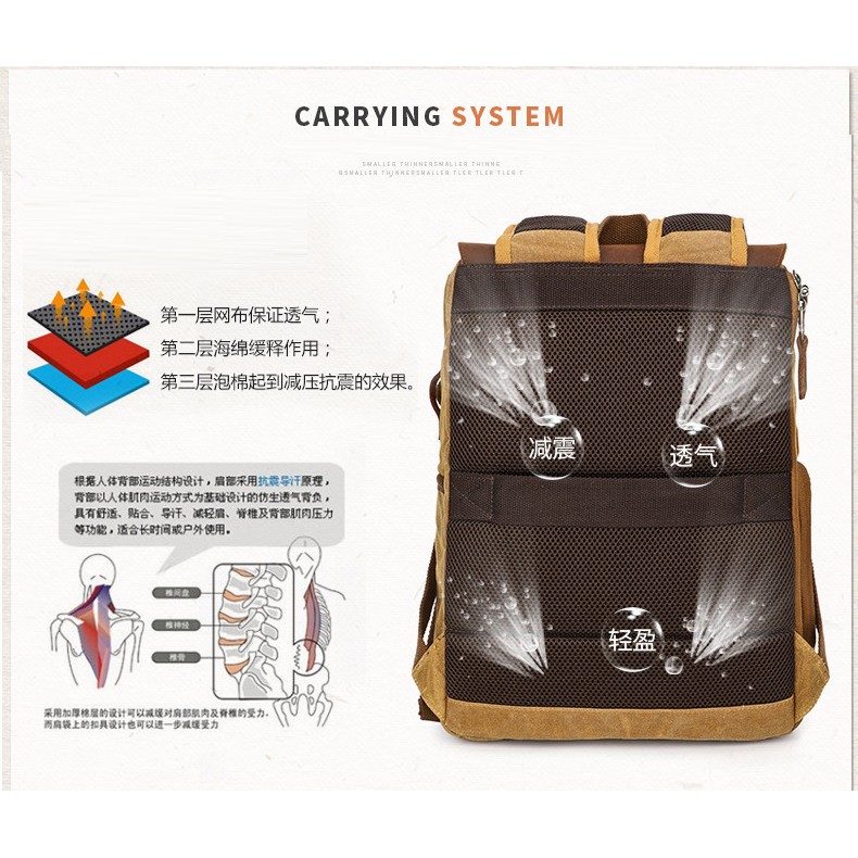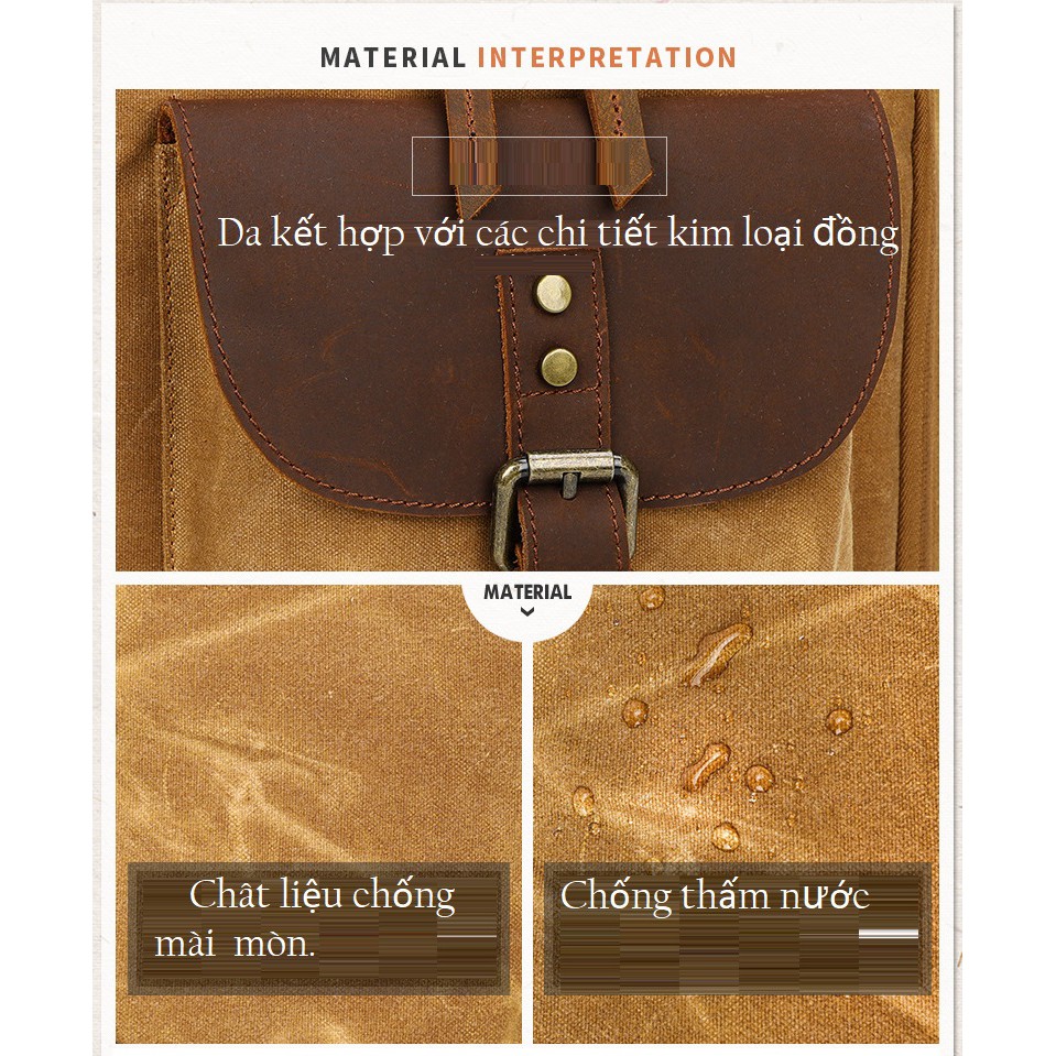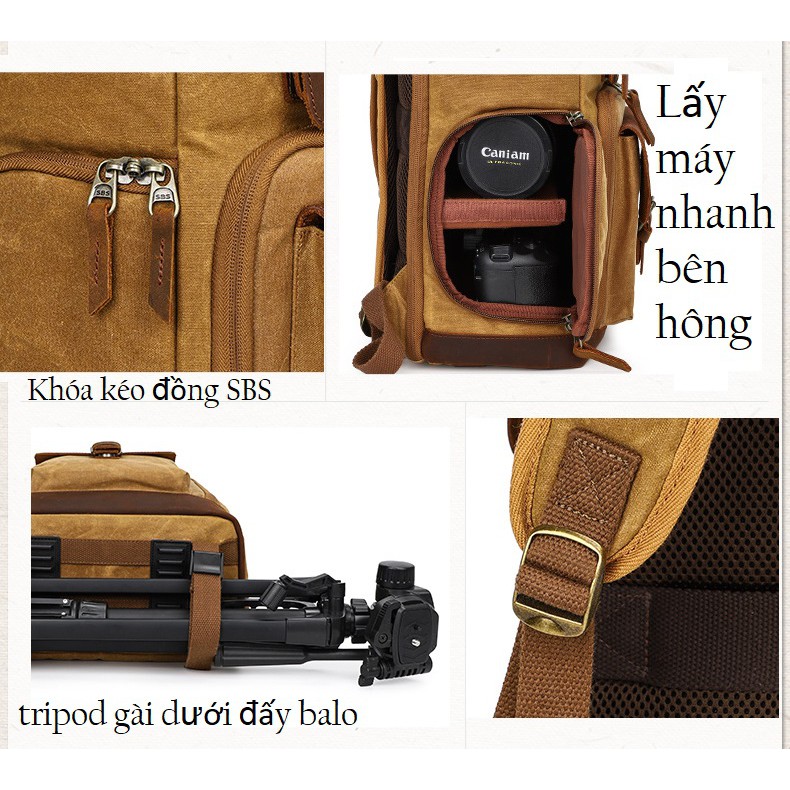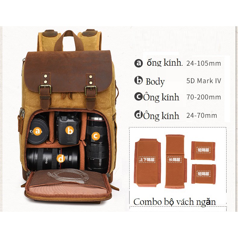 Balo máy ảnh cao cấp Canvas K_86.Balo camera vintage Được làm từ vải bố Canvas. và da, chất liệu kháng nước và bền bỉ chống mài mòn.Balo có thiết kế thời trang, kiểu dáng cổ điển. Balo được làm từ vải canvas cao cấp chống thấm nước rất tốt, được phối hợp với da bò thật tạo nên sự sang trọng cho chiếc balo.Balo có lớp mút dày, vách ngăn êm giúp bảo vệ máy ảnh khỏi những va chạm. Vách ngăn bên trong có thể tháo dời và di chuyển dễ dễ dàng sắp xếp đồ dùng.Kích thước ; 44 x 19 x 30cmNgăn máy ảnh để được 1 body + 2 lens + đèn Flash.Màu sắc :