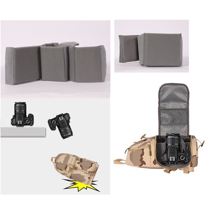 Balo có thiết kế vừa để máy ảnh vừa để đổ, bên dưới là ngăn để máy ảnh, có mút chống sốc và vách chia giúp người dùng dễ dàng sắp xếp đồ. Bên trên là ngăn để đồ dùng cá nhân, phụ kiện máy ảnhBalo được chia lam hai ngăn chính ngăn chống sốc cho máy ảnh và ngăn để đồ dùng rất tiện dụng