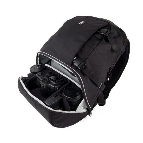 Ngăn đựng máy ảnh mở nửa dưới của balo với sức chứa gồm 1 body, 3 lens và phụ kiện, các vách chia lens có thể tháo rời và sắp xếp tùy ý. Mặt hông có dây cài chân máy.