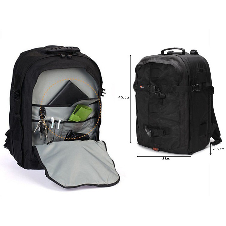 Có rất nhiều ngăn đựng máy ảnh được thiết kế. Có thể đựng được các lens dài.còn kèm theo chiếc áo mưa chống thấm 100% nhằm bảo vệ triệt để các thiết bị bên trong balo. Bao gồm: dây đai nén bên với khóa nhanh chóng phát hành, nắp rainflap đính kèm vòng SlipLock, túi bên lưới, túi phía trước kín đáo có thể chứa một áo khoác nhẹ, điện thoại di động hoặc máy nghe nhạc MP3, thẻ nhớ túi bên trong nắp , đệm lưới dày, dây đeo vai đệm với 5 điểm điều chỉnh, dây cột đệm, vải lấy tay cầm; zippered túi tài liệu.