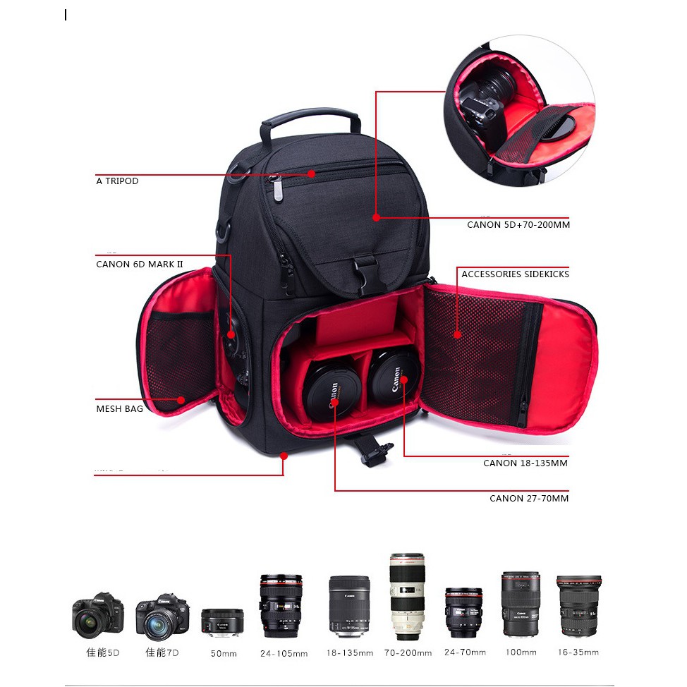 Sử dụng vải chống thấm nước 600D. Kiểu đeo 1 quai giúp thao tác nhanh, lấy máy dễ dàng và nhanh chóng.- Kích thước: 36 x 25 x 15 cm. Để được 2 body+ 2 lens zoom+ phụ kiện. Có ngăn để iPad 9.7inch mặt sau.