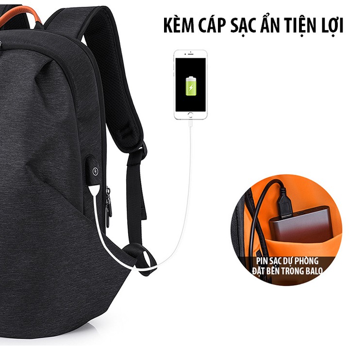 Balo được tích hợp cáp sạc ẩn được bọc vải và may đường chỉ rất chắc chắn bên hông phải của balo có một cổng USB giúp bạn có thể để dàng cắm dây sạc điện thoại vào. Tuy nhiên nó chỉ là một