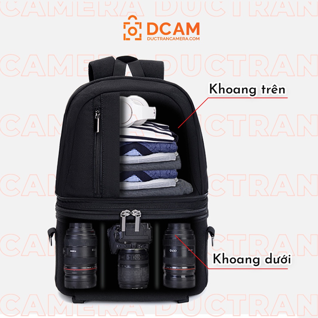 ■ Khoang túi máy ảnh chia thành 3 ngăn, khoang trên rộng rãi có thể đựng vừa fly cam, quần áo, đồ đạc phụ kiện,…