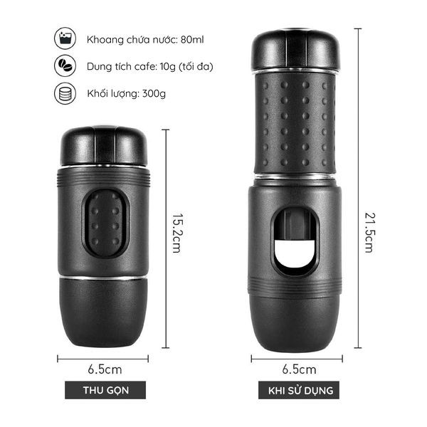 Chỉ mất chưa đầy một phút để pha một tách cà phê, tiện dụng cho văn phòng, cắm trại, du lịch hay ở nhà. Với máy pha cà phê nhỏ và nhẹ này, bạn sẽ có thể có cà phê của mình bất kể bạn ở đâu.