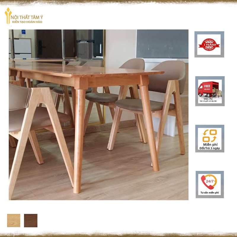Nét độc đáo của bộ sản phẩm này là chân ghế có hình chữ A, tạo nên sự mới là và hiện đại cho không gian nhà ăn. Chính vì đặc điểm này mà Bộ bàn ăn Chữ A ngày càng được người dùng ưa chuộng và ưu tiên lựa chọn cho không gian nội thất gia đình.- Chất liệu: gỗ cao su, nệm simili