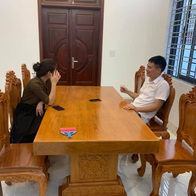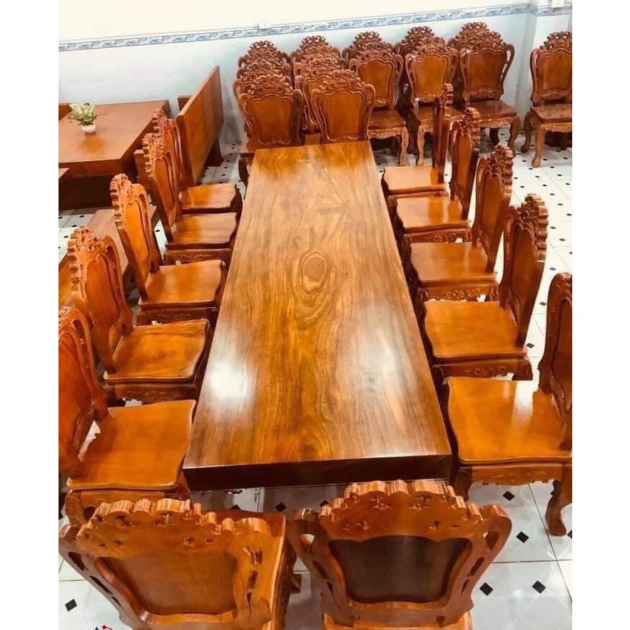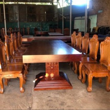 Mặt bàn nguyên khối chữ nhật dài 3m01, rộng 90cm, dày 15cm, cao 77 cm nổi vân gỗ độc đáo và 12,16 ghế louis