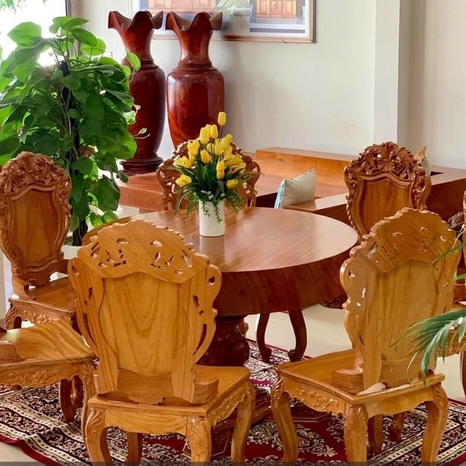 Nhà cửa & Đời sống > Nội thất > Khác || Bộ bàn ăn tròn nguyên khối gỗ gõ đỏ 7 ghế đục hoa lá tâyCòn hàng