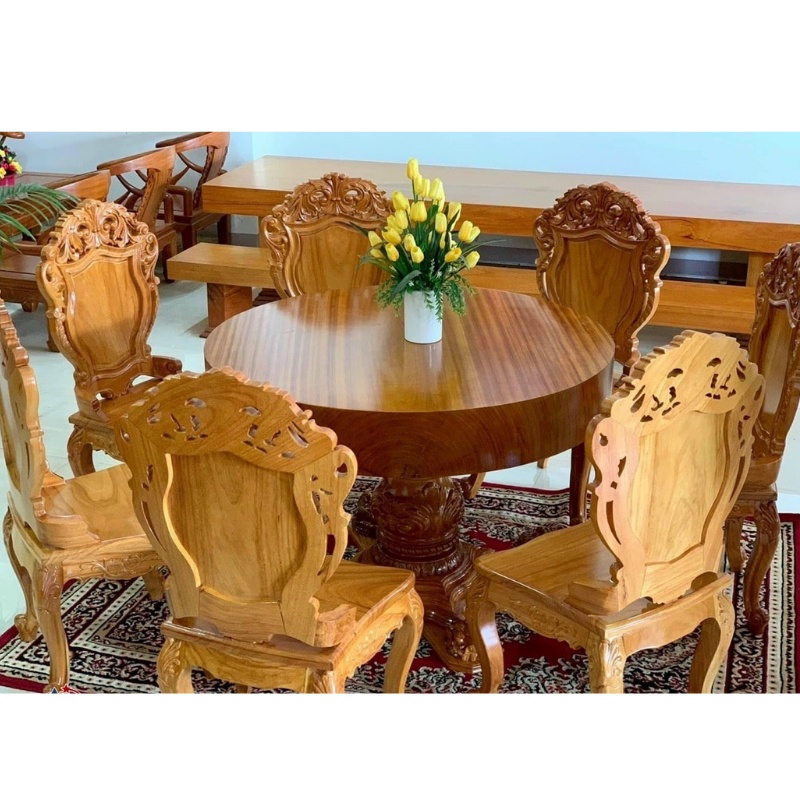Bộ bàn ăn tròn nguyên khối gỗ gõ đỏ 7 ghế đục hoa lá tây