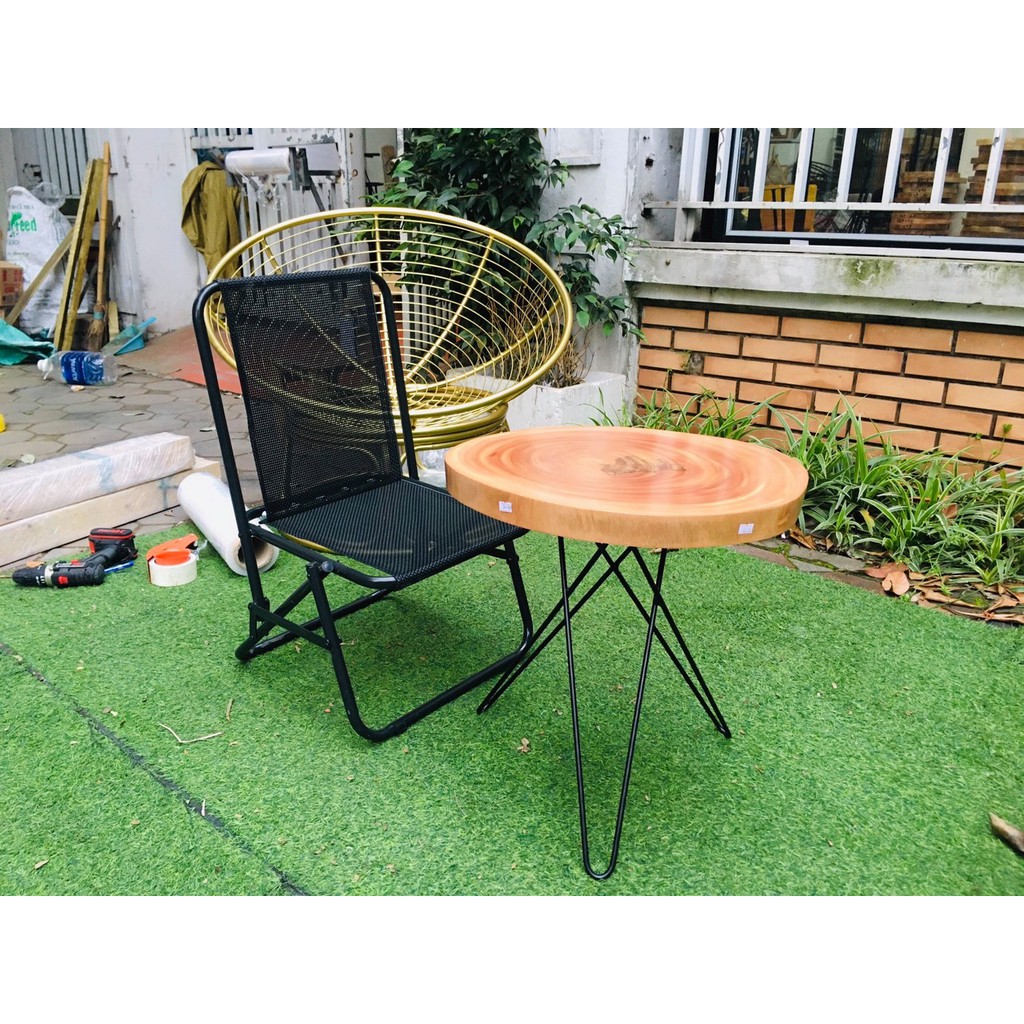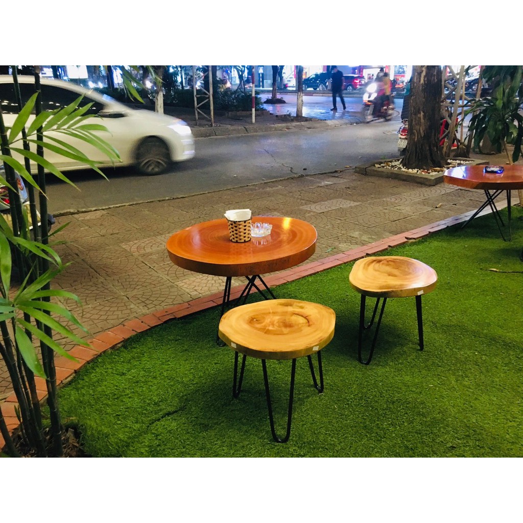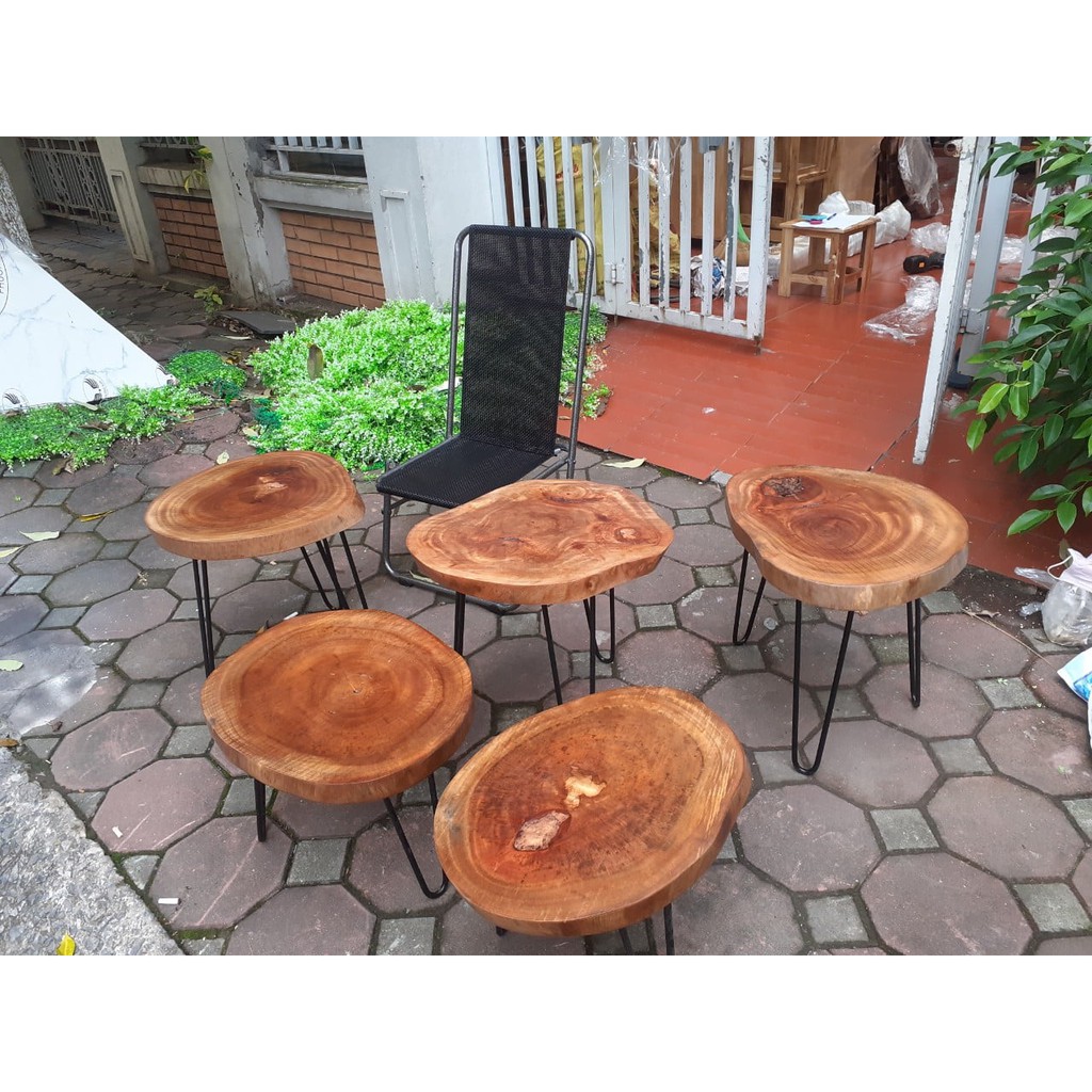 Giới thiệu Bàn cafe gỗ xà cừ gỗ nguyên tấm| Bàn trà Decor ban công Đường kính 25cm - 55cm - Chân hairpin cao 40 - 50cm Tổng