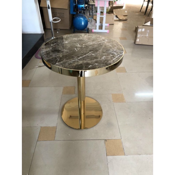 Bàn cafe tròn chân mạ vàng mặt mica giả đá cao cấp thiết kế hiện đại, tinh tế và sang trọng giúp tăng tính thẩm mỹ cho không gian sử dụng. Với mặt bàn làm từ mica tráng đá cao cấp không chỉ đẹp mắt mà còn rất bền bỉ, tuổi thọ sử dụng dài lâu. Chân bàn được làm từ inox mạ vàng theo kiểu dáng chân trụ tròn vô cùng thu hút, sang chảnh và chắc chắn, an toàn khi sử dụngThông số sản phẩm: