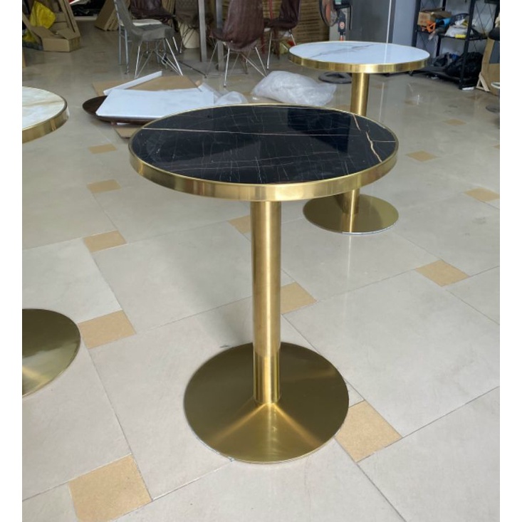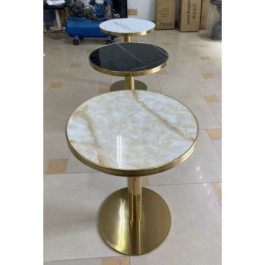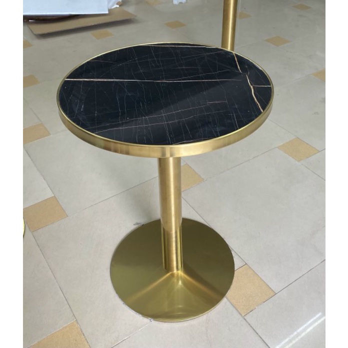 Vật liệu: Mặt Mica vân đá viền inox mạ vàng, Chân inox mạ vàng.