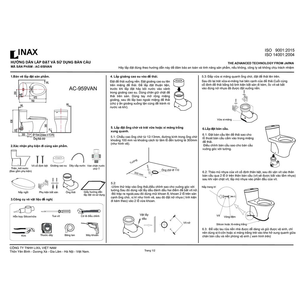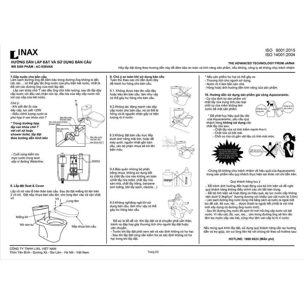 Giới thiệu Bàn cầu 1 khối cao cấp INAX AC959VAN, công nghệ Aqua ceramic, nắp rơi êm, 2 nhấn tiết kiệm nước, bảo hành 10 năm