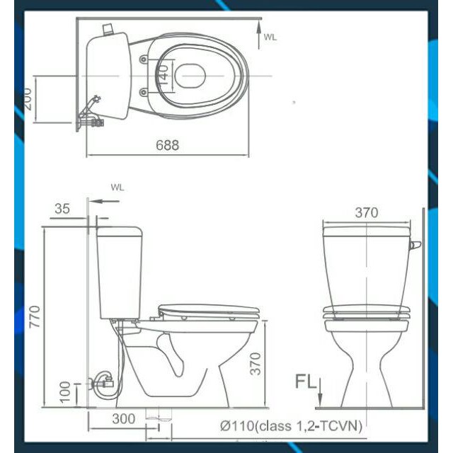- Kích thước: Dài 688 x rộng 370 x bệt cao 370 x thùng cao 770