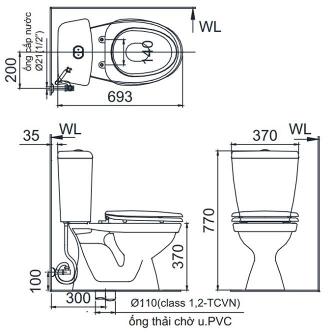 - Kích thước: Dài 680 x rộng 370 x bệt cao 370 x thùng cao 770
