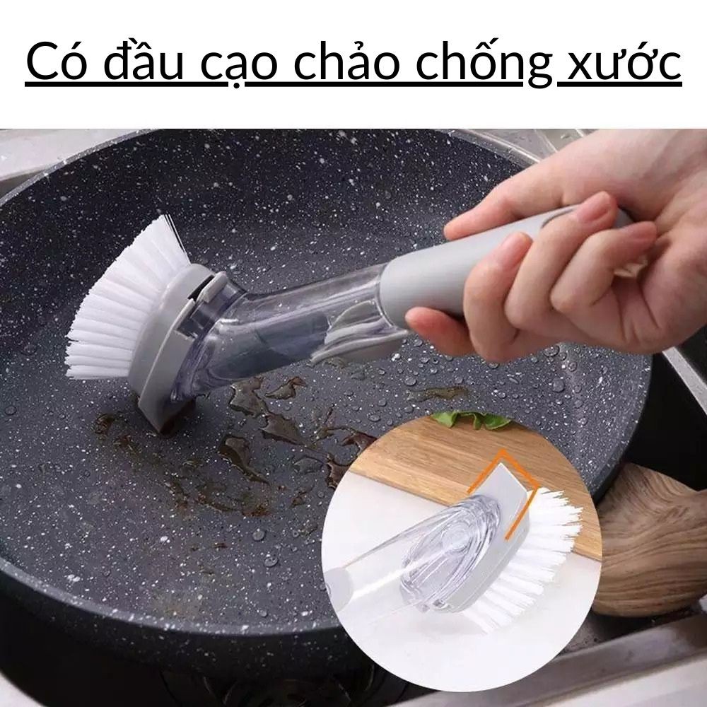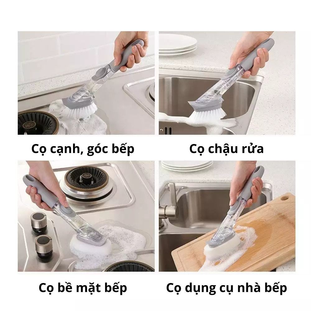 Bàn chải đa năng có bơm chất tẩy rửa chuyên dùng cho lau chùi Đồ nhà bếp (Nồi Chảo Bát Đĩa, Bếp từ, Bếp gas); Bồn rửa tay, Bồn rửa bát; Nhà tắm; Các đồ gỗ, Thủy tinh, Sứ...Điểm đặc biệt: Tích hợp bình chứa chất tẩy rửa lỏng, kết hợp tay cầm dài nên không làm ướt tay người sử dụng.