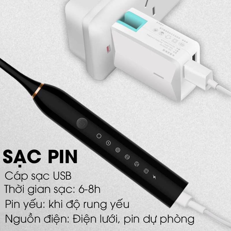Trang bị theo bàn chải bao gồm: Thân bàn chải, 3 đầu bàn chải, cáp sạc USB, HDSD và phiếu Bảo hành.