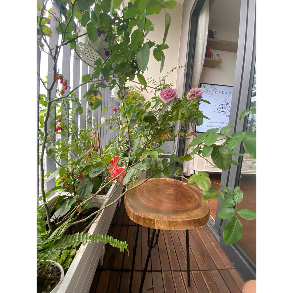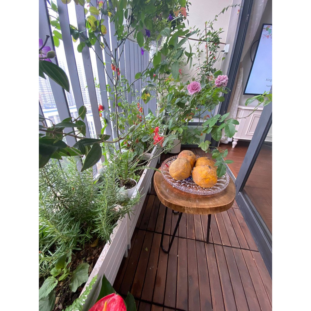 Giới thiệu Bàn để ban công gỗ xà cừ chân hairpin cao 50 x D = 25 - 35cm, kệ gỗ tự nhiên nguyên tấm