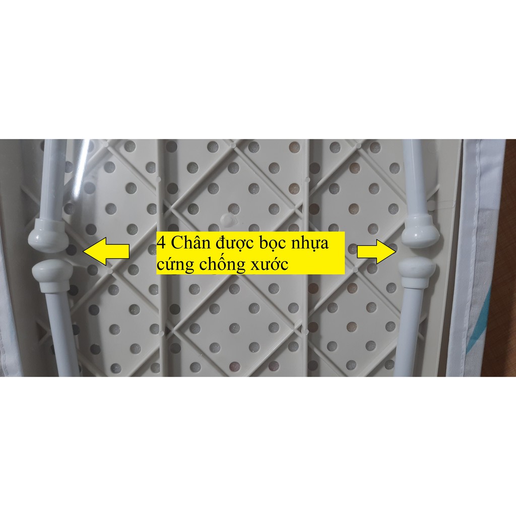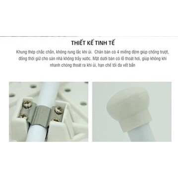 ✅Khung bàn ủi bằng nhựa PP có gia cố lực, kết hợp lỗ thoát hơi khi là hơi nước. Chân bằng thép bọc lớp nhựa chắc chắn, nhẹ, êm không làm trầy xước bề mặt gạch, chống trơn trượt và chống gây ồn khi di chuyển.