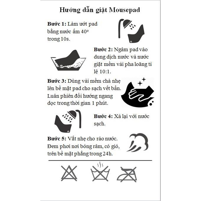 Mouse Pad có thể giặt tay hay ngâm, để tự khô, không phơi nắng trực tiếp hay hong trước gió.