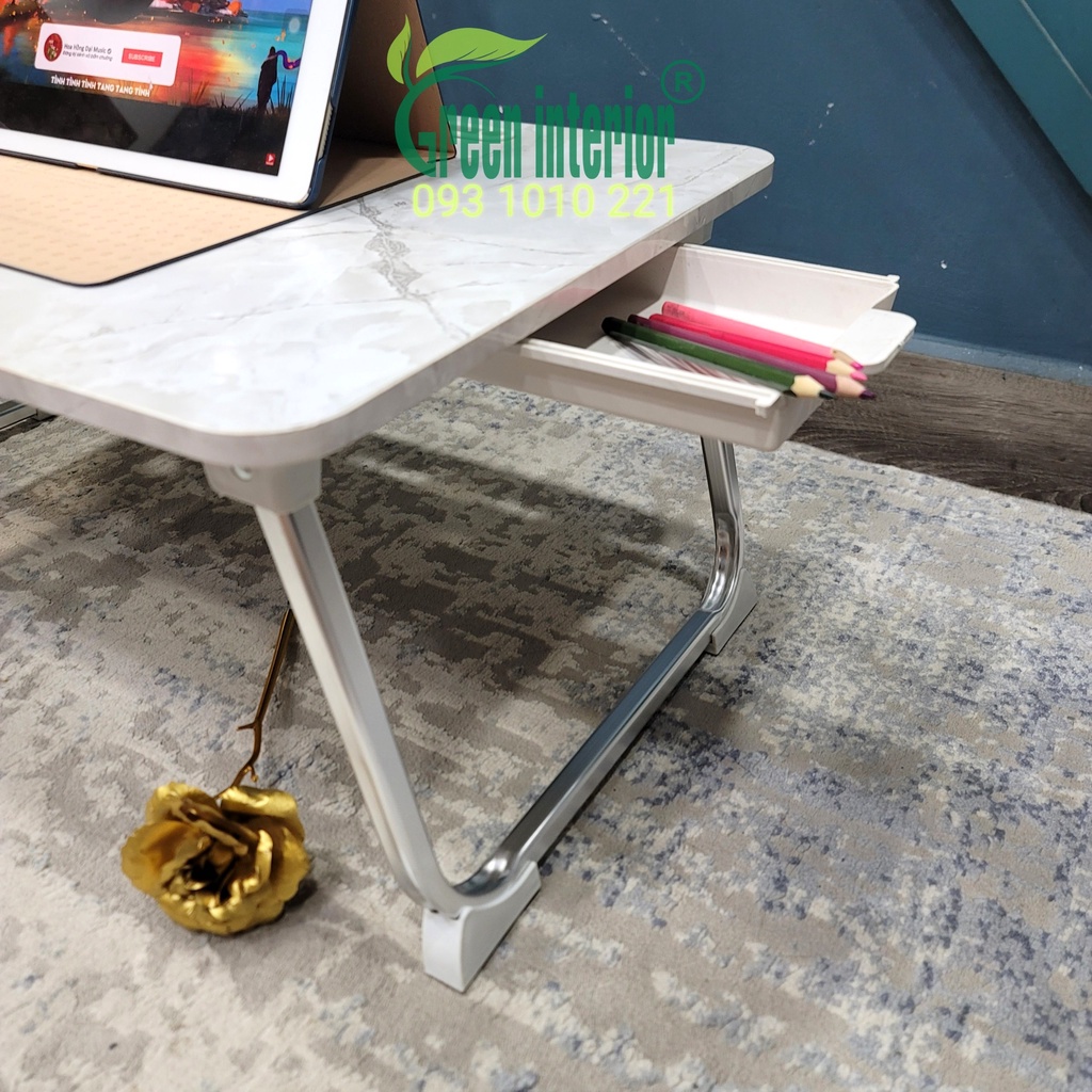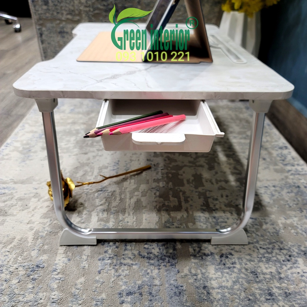 - Bàn gấp gọn, bàn làm việc chân xếp gọn có ngăn kéo Greenfurni, bàn học sinh gấp gọn TBK (Vân Đá Marble Trắng)