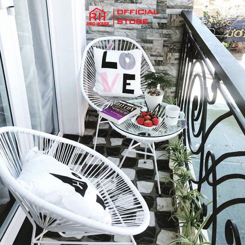 Bộ bàn ghế ban công RIBO HOUSE gồm 1 bàn và 2 ghế mây, bộ bàn ghế thư giãn trang trí phòng khách sân vườn cà phê RIBO43