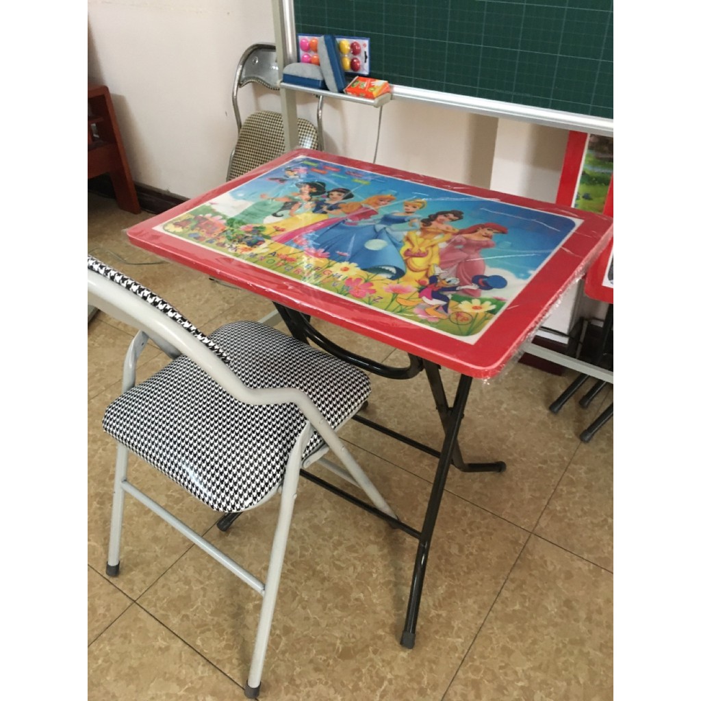 Bộ bàn ghế cao cấp- Mặt bàn đc làm bằng nhựa cao cấp chống cháy , chống nước siêu bền được in các hình dễ thương như Công chúa bạch tuyết ., nữ hoàng băng giá , siêu nhân , người nhện , in theo các hình là bảng chữ cái , bảng cửu chương để các bé tập đọc , học thật là tiện lợi .
