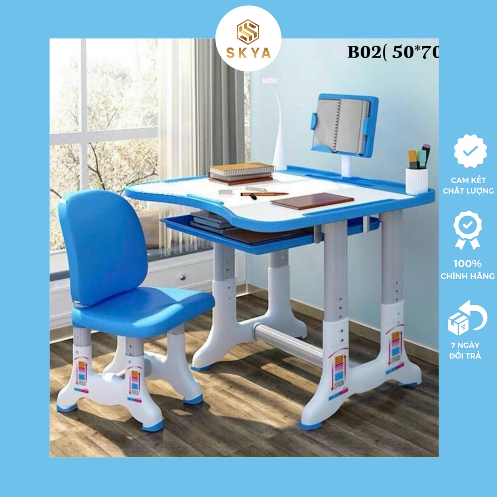 Bàn ghế học thông minh cho bé chống cận chống gù điều chỉnh độ cao 50x70 SKYA B021Đây là mẫu bàn ghế học cỡ nhỏ DUY NHẤT trên thị trường có cơ chế điều chỉnh độ cao bàn tiện lợi và có tích hợp giá kê chân cho bé, tạo điểm tựa thư giãn, vững chãi khi ngồi học .