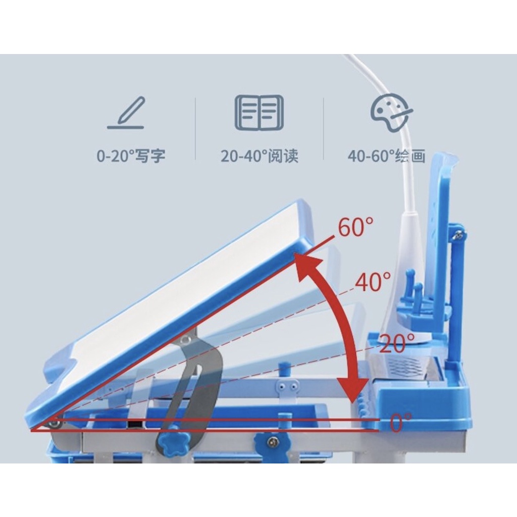 Mặt bàn có thể điều chỉnh độ nghiêng từ 0 - 60 độ dễ dàng điều chỉnh theo từng hoạt động học tập viết - đọc - vẽ của trẻ. Con ngồi học ở tư thế thoải mái và khoảng cách nhìn chuẩn, giúp bảo vệ mắt và tạo thói quen ngồi học khoa học.