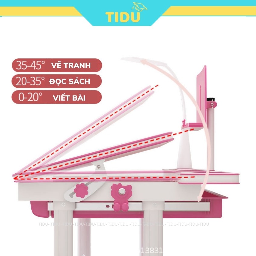 Chống cận thị, gù lưng do mặt bàn điều chỉnh góc nghiêng từ 0 đến 45 độ, tối ưu khoảng cách từ mắt trẻ tới mặt bàn. Bàn ghế có thể nâng lên hạ xuống, điều chỉnh nhiều góc độ khác nhau.