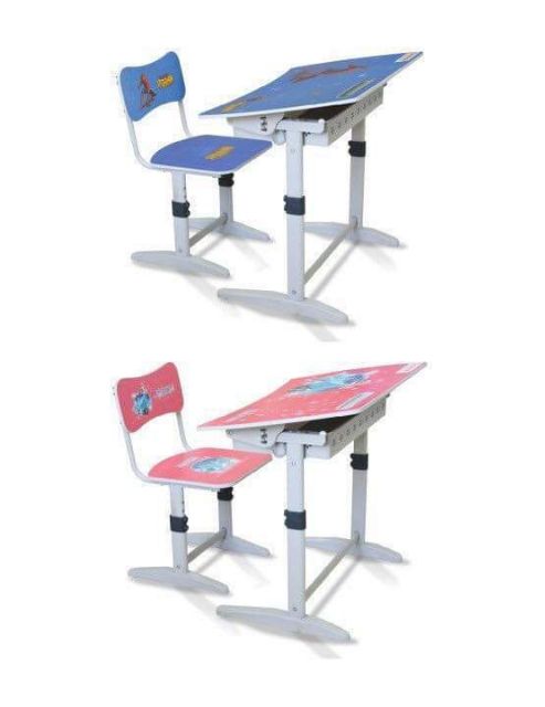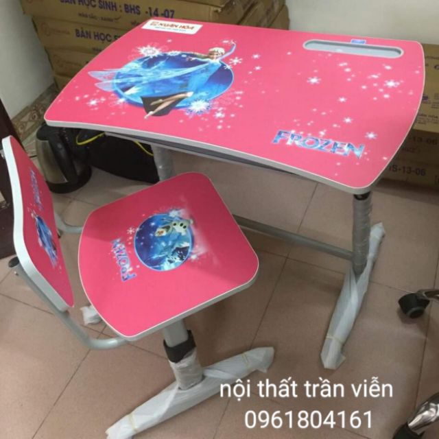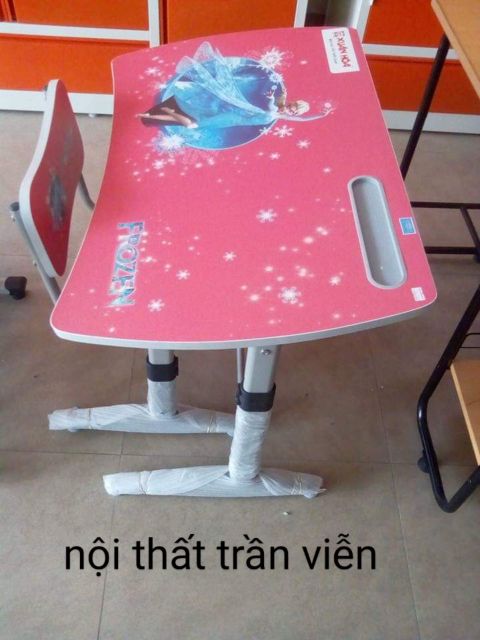 + Mặt bàn, mặt ngồi, tựa làm bằng MFC màu hồng và xanh có in hình công chúa siẻu nhân, chịu được lực lớn, không mối mọt, không thấm nước.