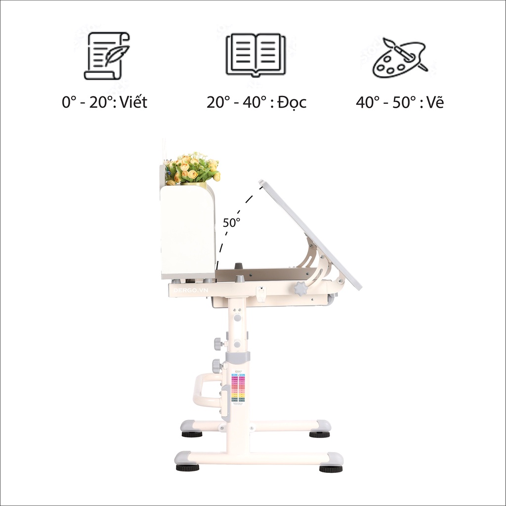 Mặt bàn có thể nâng hạ độ cao từ 52 - 75cm, phù hợp với vóc dáng, chiều cao của các bé trong độ tuổi từ 3 đến 18 tuổi. Thiết kế này giúp vừa vặn với cơ thể bé, tránh gây mỏi lưng hay ngồi quá thấp hoặc quá cao.
