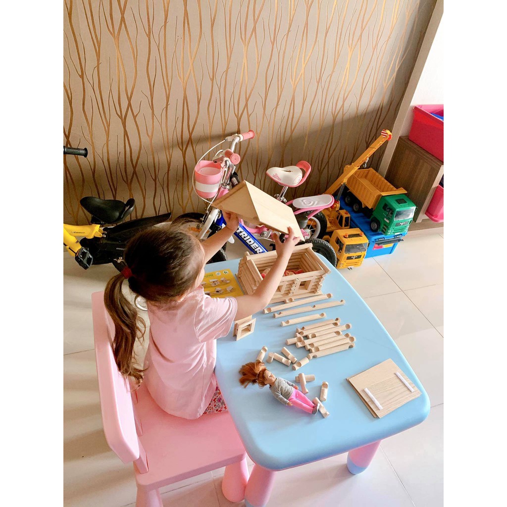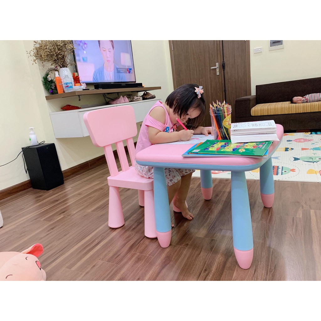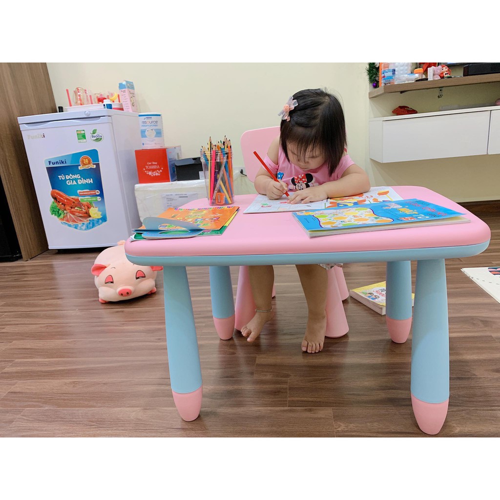 Bao gồm bàn và ghế tựa , Có thể mix màu ghế xanh và hồngBàn ghế chất liệu nhựa ABS an toàn , chống trơn trượt , dễ vệ sinh.