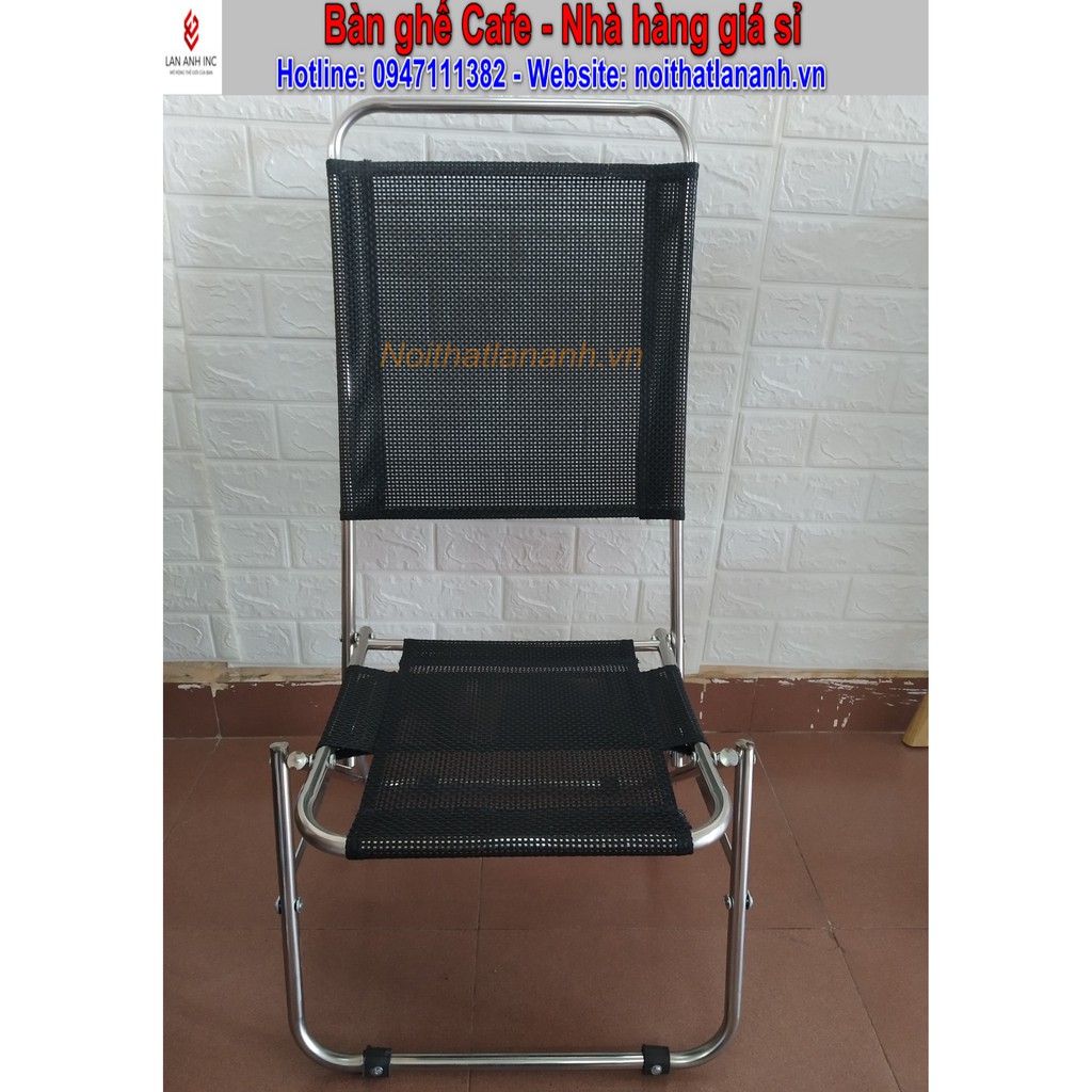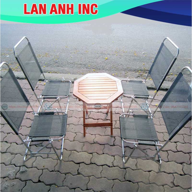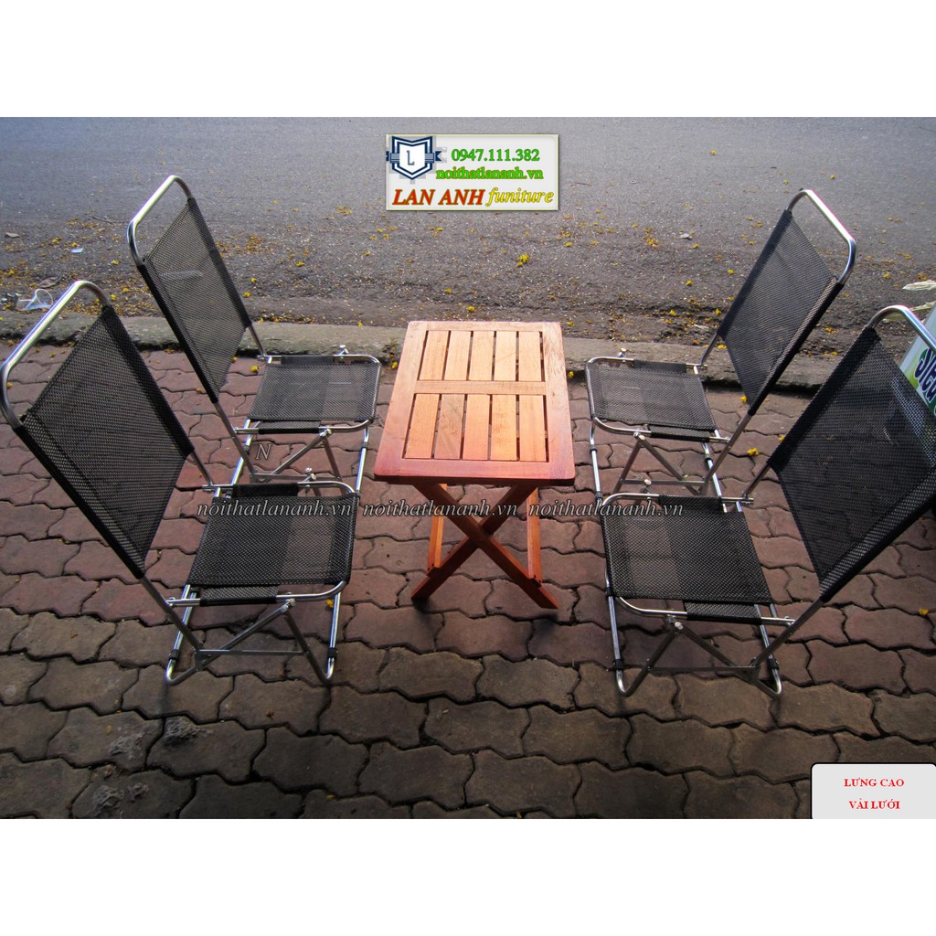 Trọn bộ bàn ghế xếp cafe, trà sữa, đồ ăn vặt giá rẻThành phần: 1 bàn gỗ xếp hoặc bàn trà chanh và 4 ghế xếp inox lưng cao vải lưới)