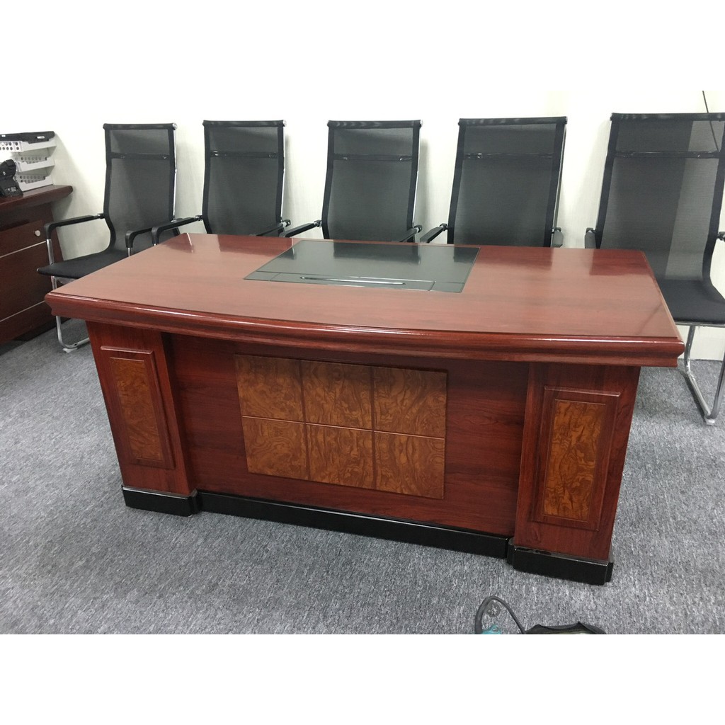 Bàn giám đốc GD-B11 được thiết kế sử dụng trong phòng giám đốc, phòng lãnh đạo.Mặt bàn lượn cong, dày 80mm, trên mặt có tấm PVC trang trí phần ngồi viết. Yếm ghép hộp lượn cong dán giấy khác màu kết hợp nẹp nhôm mang lại không gian sang trọng hiện đại cho phòng giám đốc.