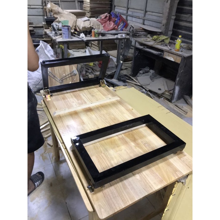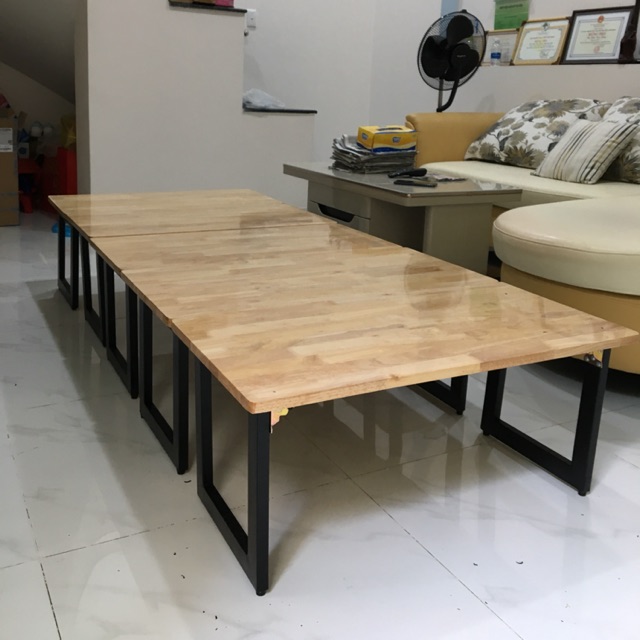Mặt ván: cao su phủ keo 2 mặt, rộng: 40cm, dài 100cm, nẹp thanh ngang chống công vênh trong quá trình sử dụngChân sắt vuông 4x4cm cao 50cm tính cả mặt bàn