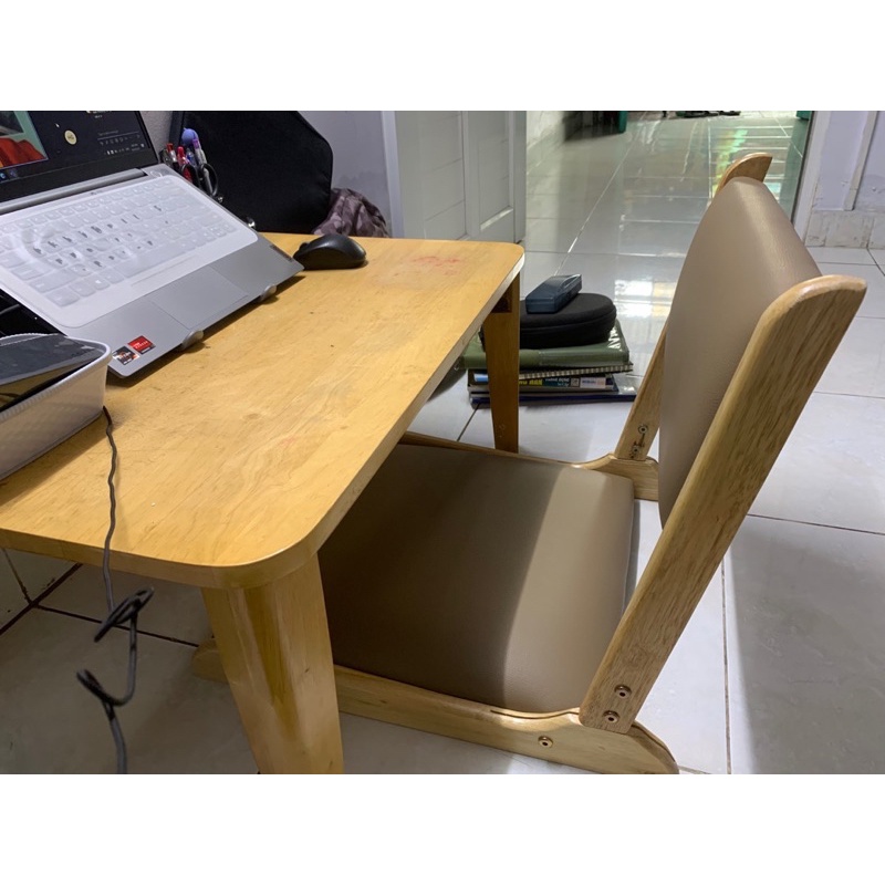 Combo Bàn gỗ xếp gọn và ghế bệt mặt nệm 47wood, thích hợp cho làm việc và học tập tại nhà.Bàn gỗ cao su chống nước 50x70cm cao 30cm, Ghế ngồi nệt mặt nệm êm ái.