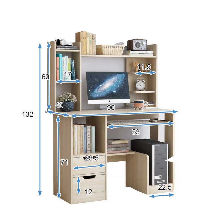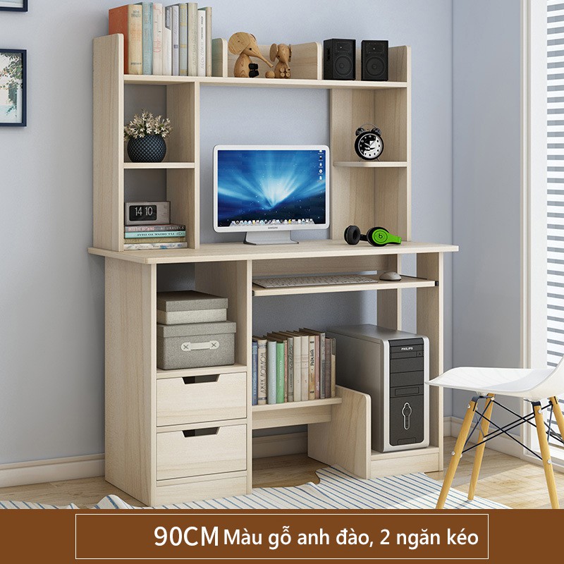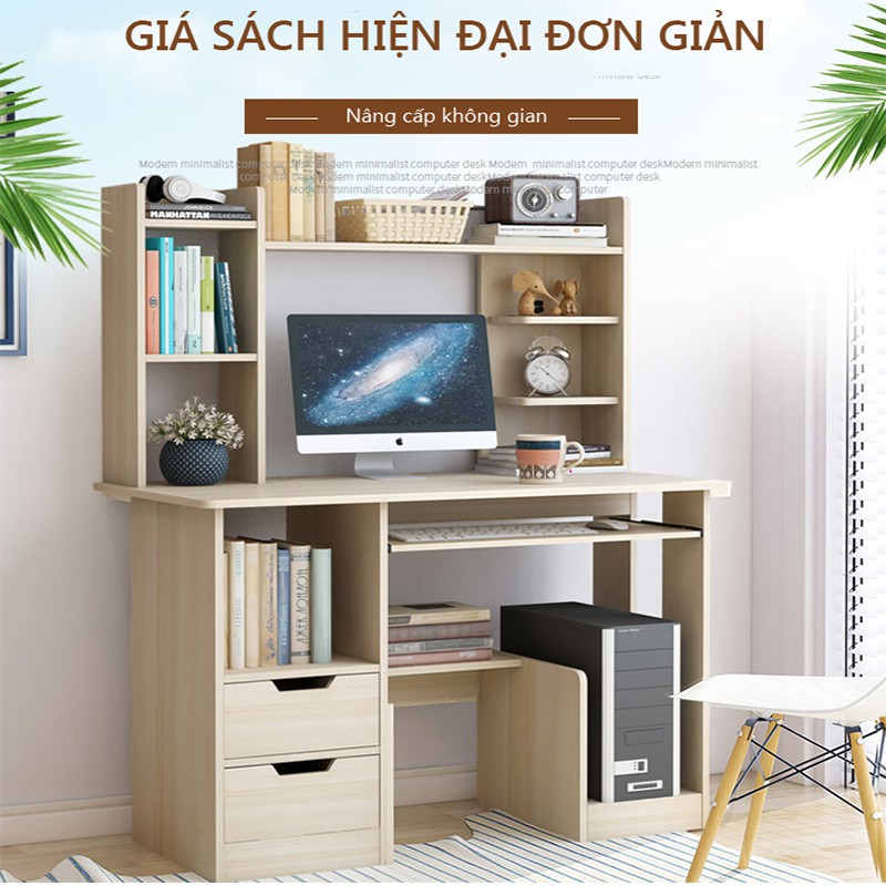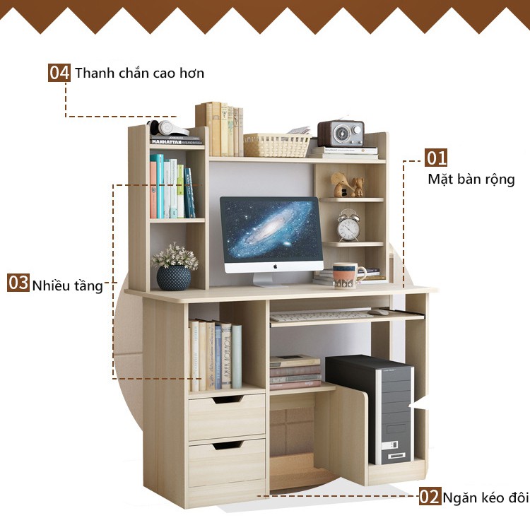 Bàn học gỗ bàn máy tính giá sách gỗ tủ sách gỗ bàn học kèm giá sách bàn máy tính đa năng4 điểm sáng: Nhiều không gian, mặt bàn rộng, ngăn kéo đôi, thanh chắn cao